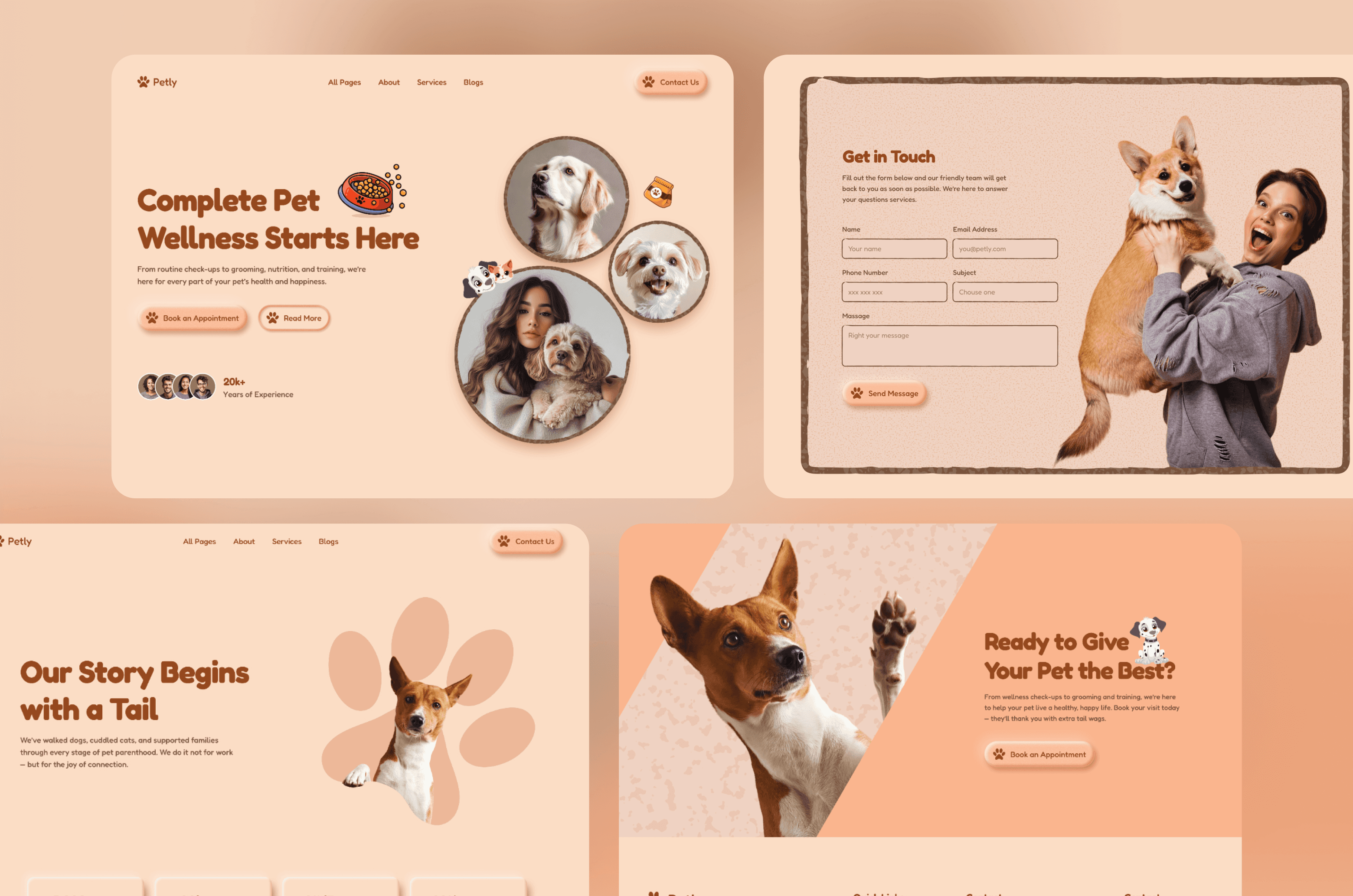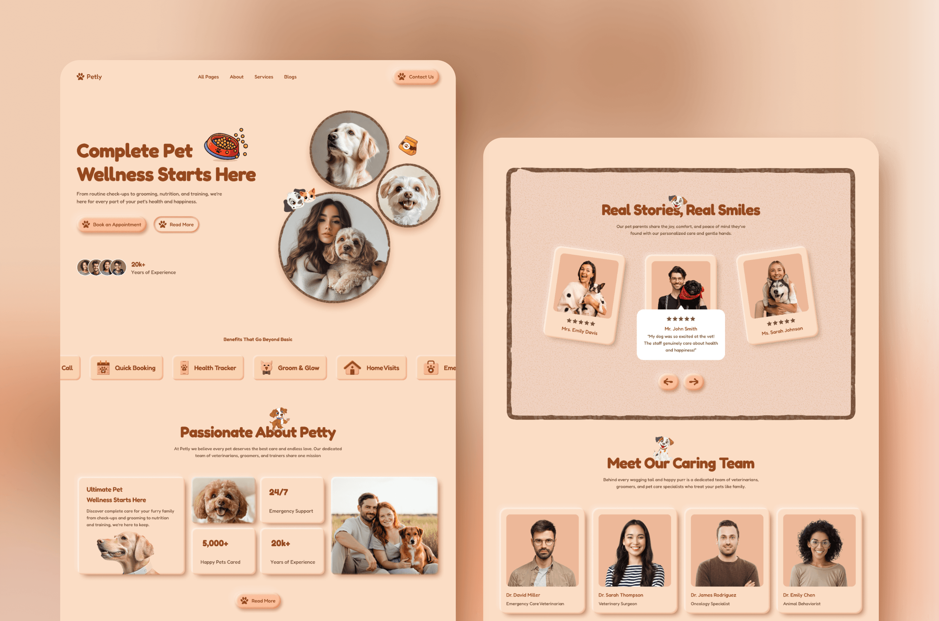 🔹 Home Page – Introduces your brand, featured pets, services, and testimonials in a smooth, engaging flow.